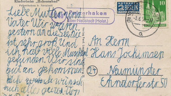 Hier aber eine von Kinderhand geschriebene Postkarte aus dem Schullandheim Helenenbad in Pelzerhaken an der Ostsee an die Mutter in Neumünster aus dem Jahr 1950. Die Postleitzahl im Kreis wurde der Poststelle und dem Leitpostamt vorangestellt.