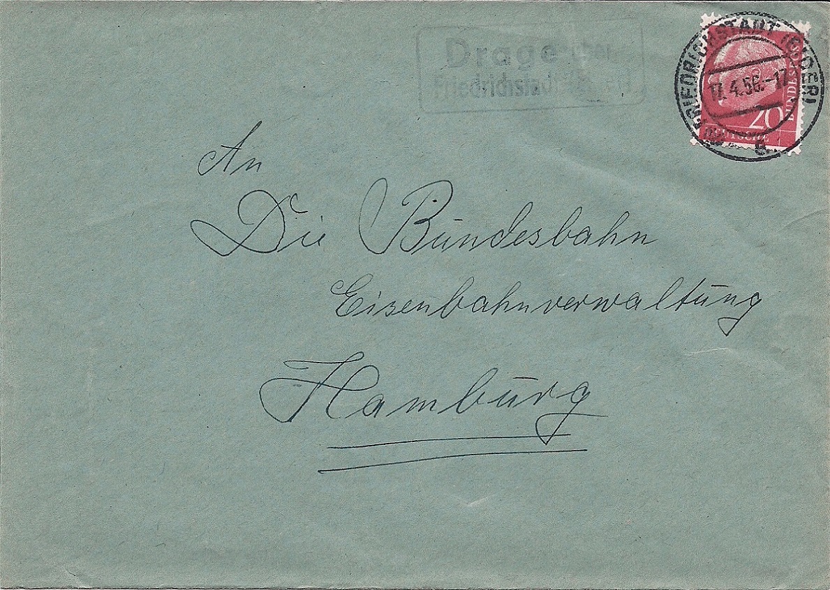 hier mal wieder ein relativ moderner Poststelle II Stempel auf einem mit einer 20 Pfg Heuss frankierten Brief aus Drage nach Hamburg.