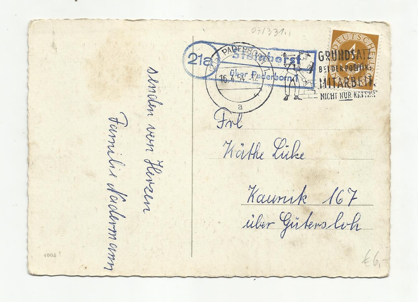 Die Karte wurde in Borsthusen aufgegeben, die Marke wurde im nahe gelegenen Garding (Schlesw.) a am 30.9.59 abgestempelt.