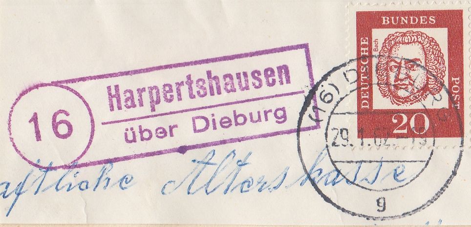 Die Gummistempel der Poststellen II sieht man meist in violetter Farbe. Aber nicht immer, es kommen auch andere (bunte) Farben vor. Hier mal am Beispiel der PSt II Harpertshausen über Dieburg. Im Laufe der Jahre in verschiedenen Farbtönen!