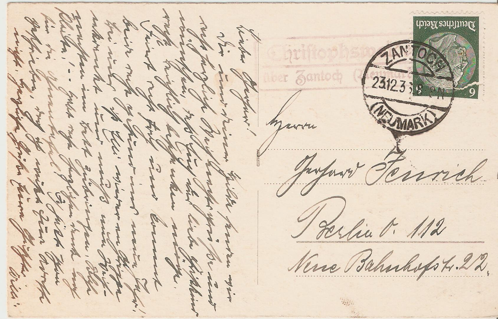 Vielleicht hat ja jemand ein Ortslexikon aus den 30er Jahren und kann mal nachsehen, ob es zu der Zeit eine Poststelle diesen Namens im Landkreis Schleswig gegeben hat.