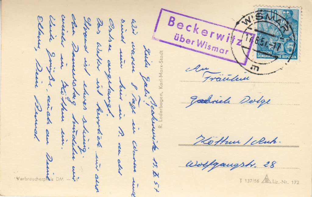 Postellen-II-Stempel Beckerwitz über Wismar.
