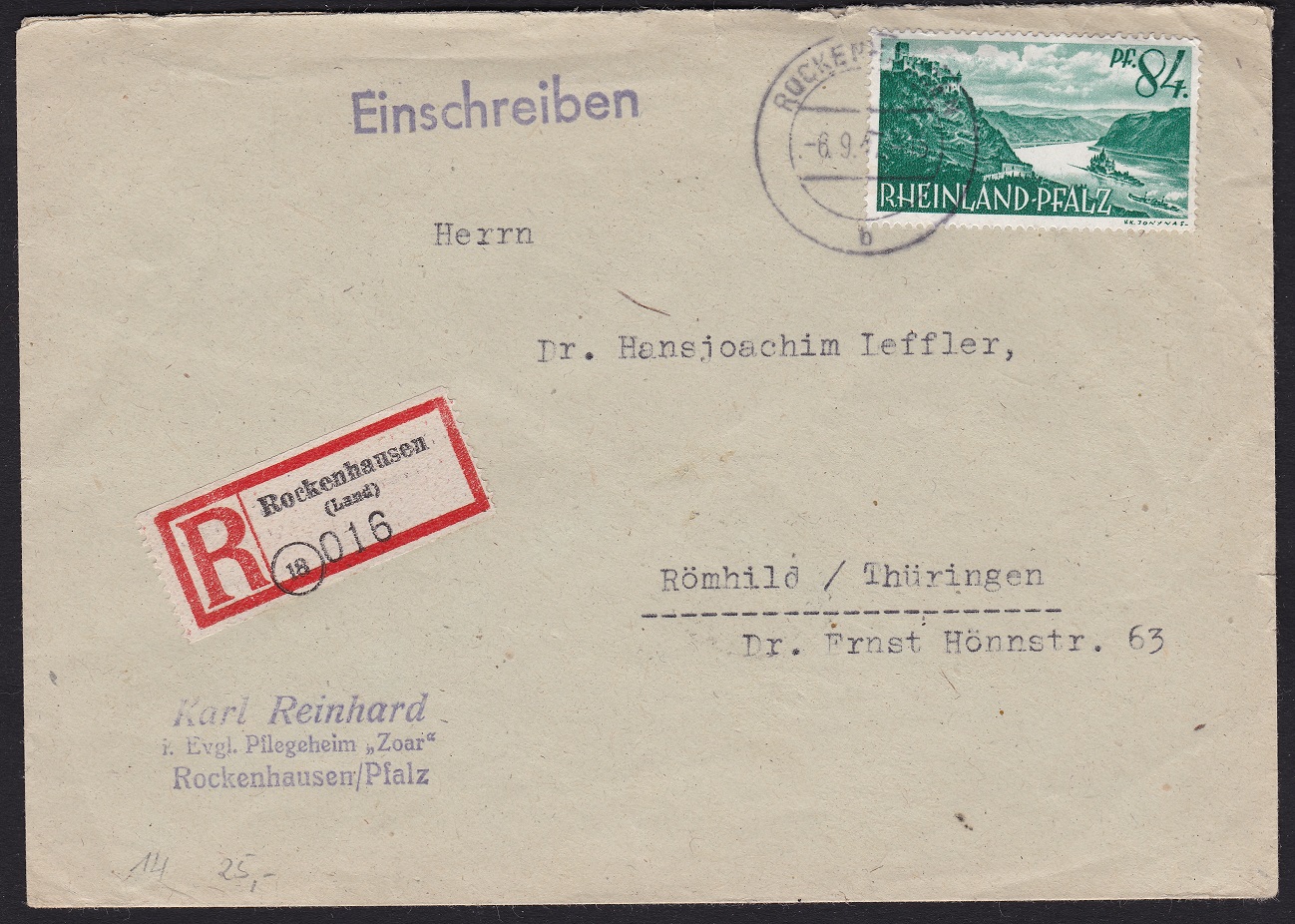 Der eingeschriebene Brief ist beim Leitpostamt aufgegeben worden, somit kein Poststelle I bzw. II Beleg. Aber aus Sparsamkeitsgründen oder angesichts mangelnder "normaler" Einschreibzettel griff man auf Einschreibezettel "Rockenhausen (Land)" zurück, die eigentlich für eingeschriebene Postsendungen aus den angeschlossenen Poststellen vorgesehen waren.