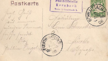 Eine Postkarte von August 1906 gestempelt von der Posthilfsstelle Kersbach, abgestempelt in Schnaittach und am Ankunftsort Fürth.