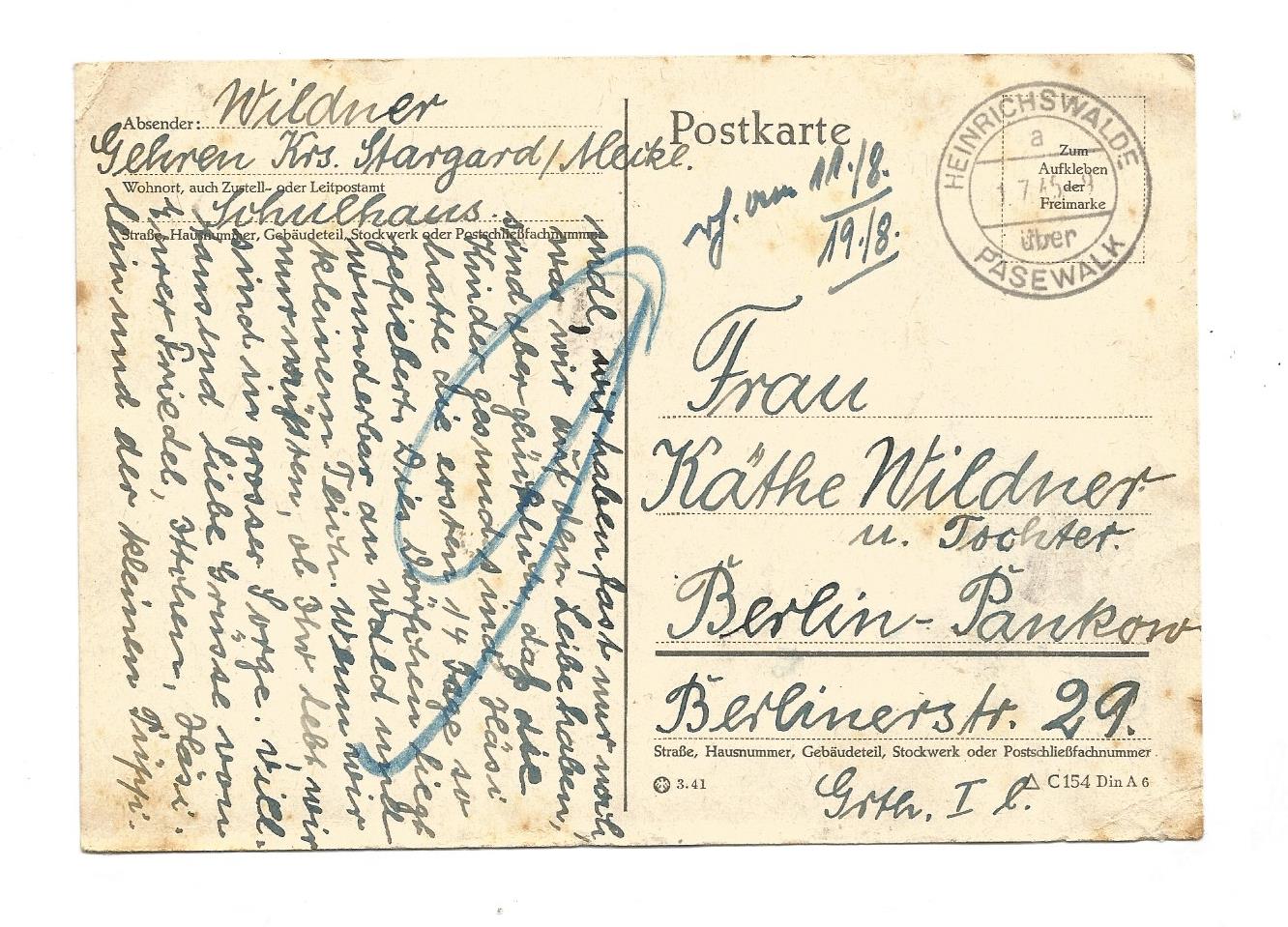 Poststelle I Stempel Heinrichswalde über Pasewalk vom 1.7.1945. Heinrichswalde ist eine Gemeinde in Vorpommern im Osten von Mecklenburg-Vorpommern. Die Postkarte stammt von einer Flüchtlingsfamilie, die eine Notunterkunft im Schulhaus von Gehren, Kreis Stargard, gefunden hatte. Die Sendung ist nach Berlin-Pankow gelaufen. Unfrankiert wurde die Postkarte mit 9 Pf. Nachporto belegt. Der Text ist ein interessanter Beleg für die Unsicherheit in der unmittelbaren Nachkriegszeit, als Millionen Menschen froh darüber waren, nach den Kriegswirren und der Flucht überhaupt ein Dach über dem Kopf zu haben und sich nun per Post auf die Suche nach Verwandten und Bekannten machen konnten.