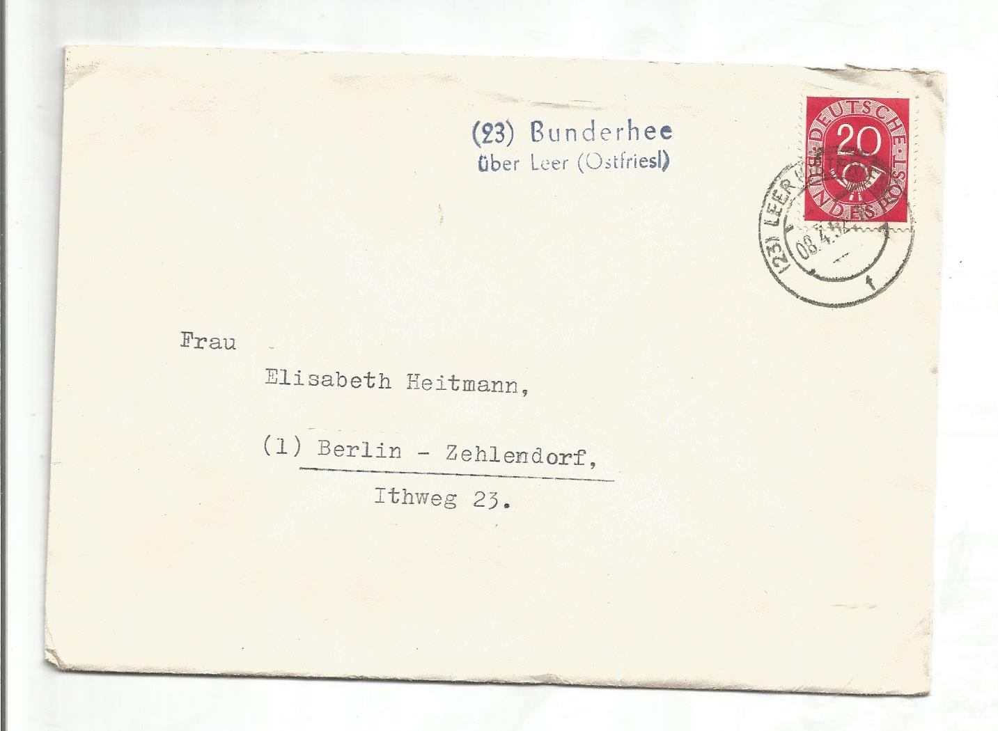 Heute kann ich Euch einen neuen Fund aus Ostfreisland vorstellen, ein Poststelle II Stempel (23) Bunderhee über Leer (Ostfriesl.), Frankiert mit einem 20 Pf. Posthörnchen, wurde der Brief nach Berlin am 8. August 1952 in (23) Leer (Ostfriesl.) entwertet
