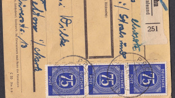 Und ein weiteres Exemplar von Prohn über Stralsund vom (6.6.1948?). Abgebildet sind zwei Seiten eines Paketkartenabschnittes.