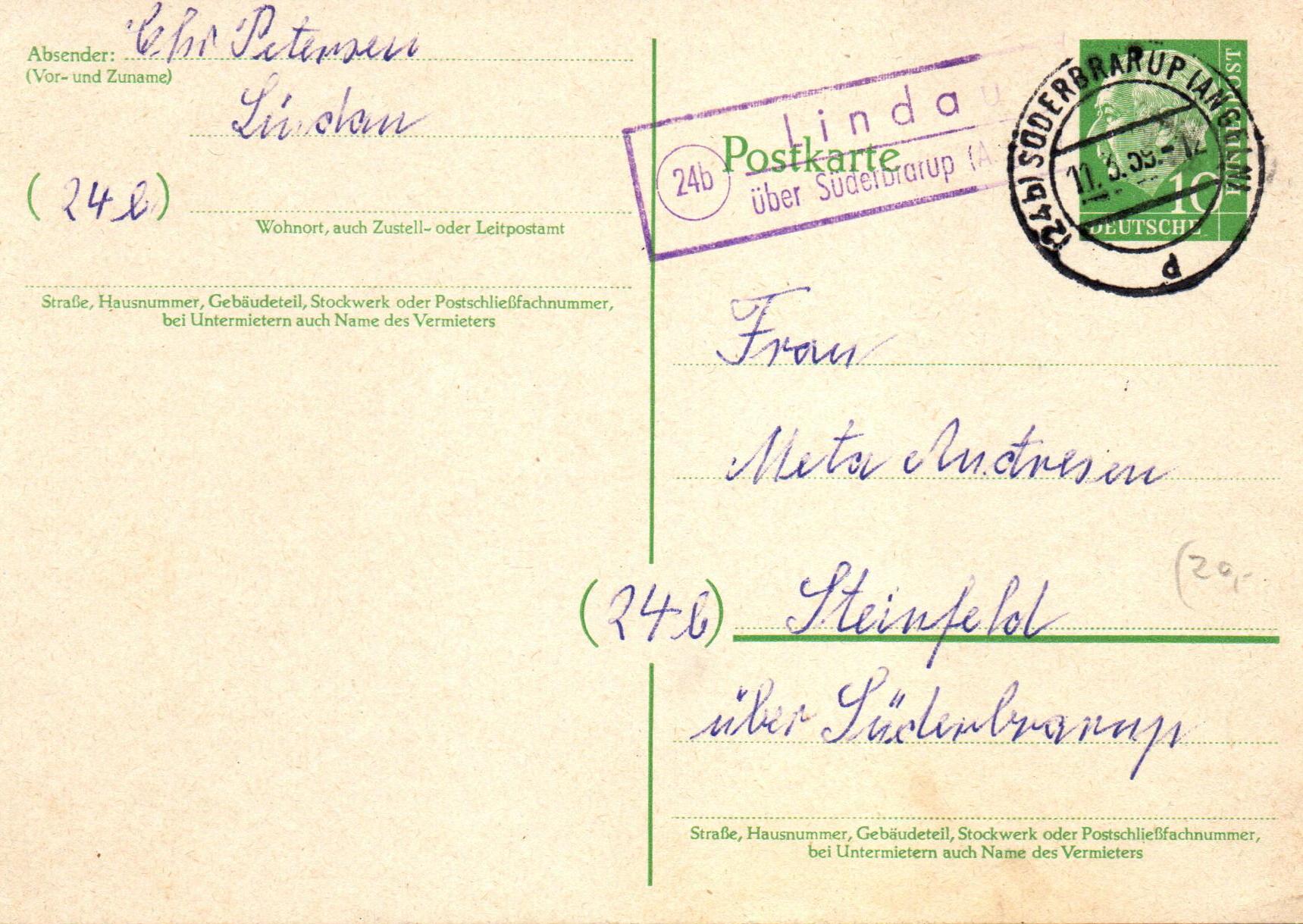 Lindau gibt es nicht nur im Bodensee sondern auch an der Schlei in Angeln. Ich zeige heute eine 10 Pfg Heuss Ganzsachenkarte aus Lindau nach Steinfeld aus dem Jahr 1959.