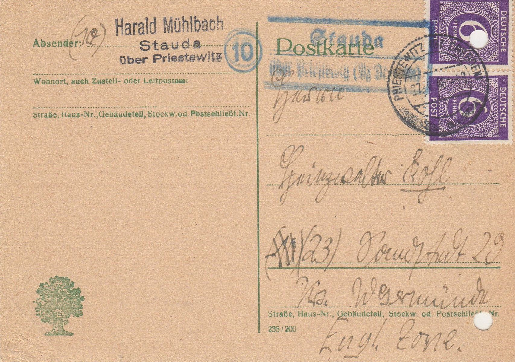 aufgegeben wurde. Die Abstempelung des Briefes erfolgte im zuständigen Leitpostamt Priestewitz (Bz. Dresden) am 27.09.1946.