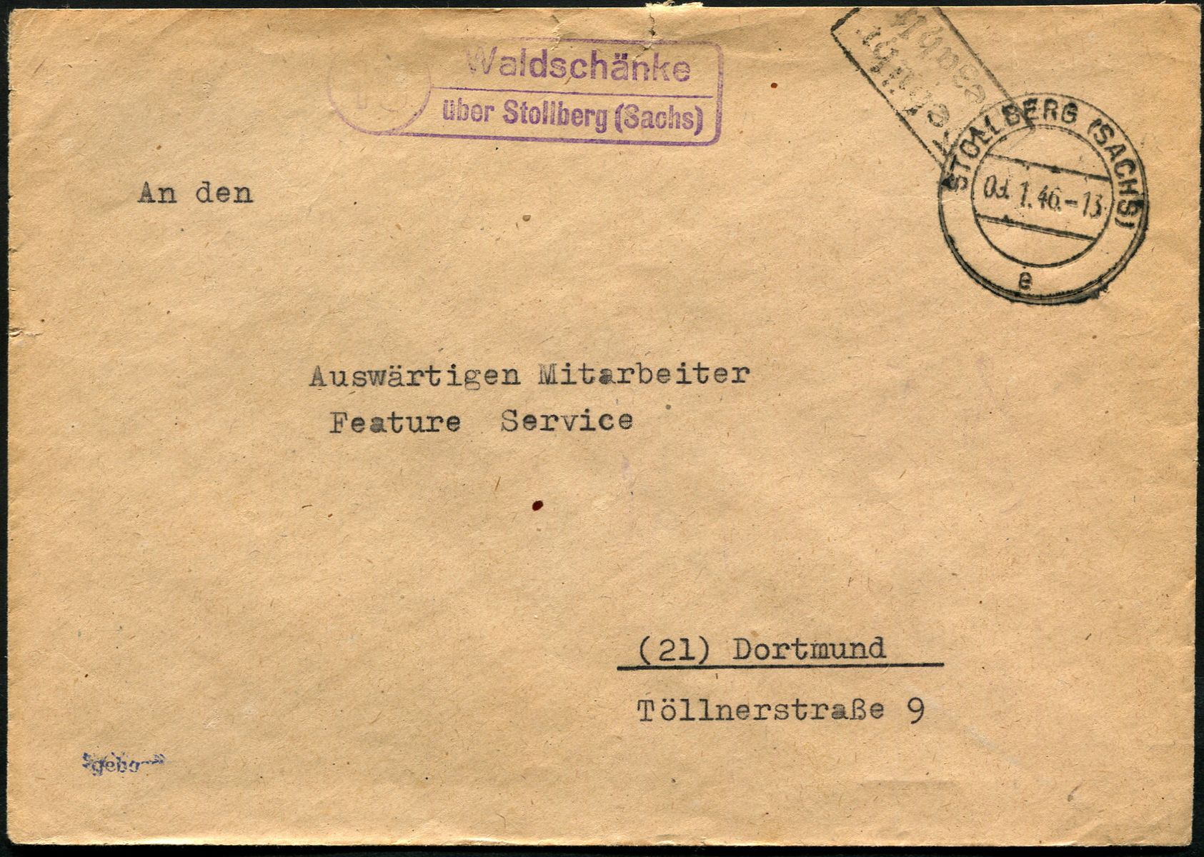 Und noch einen Fernbrief, der in der Poststelle II "Waldschänke über Stollberg (Sachs)" aufgegeben wurde. Die Abstempelung des Briefes erfolgte im zuständigen Leitpostamt Stollberg (Sachs) am 09.01.1946.