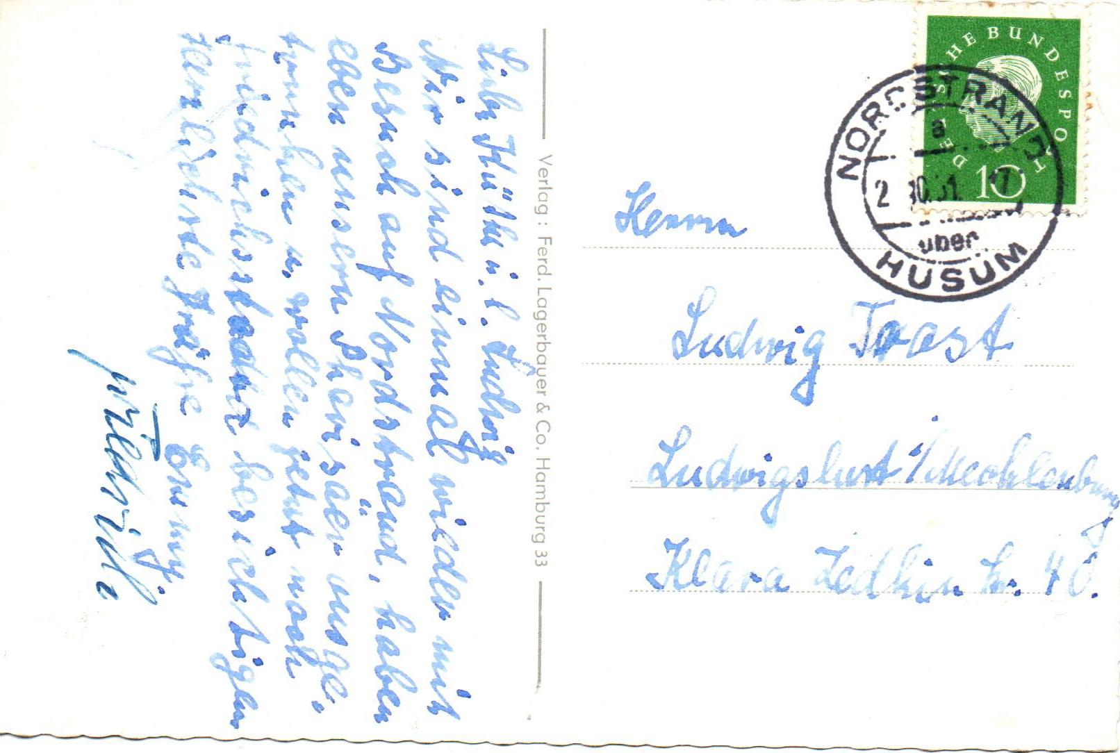 Es handelt sich um eine 08/15 Urlaubsgruß-Karte (Motiv Meeresbrandung) von der nordfriesischen Insel (heute eher Halbinsel) Nordstrand nach Ludwigslust in Mecklenburg. Die 10 Pfg. Heuss-Marke wurde mit einem Zweikreisstegstempel "Nordstrand a über Husum 2.10.61 -17" entwertet.