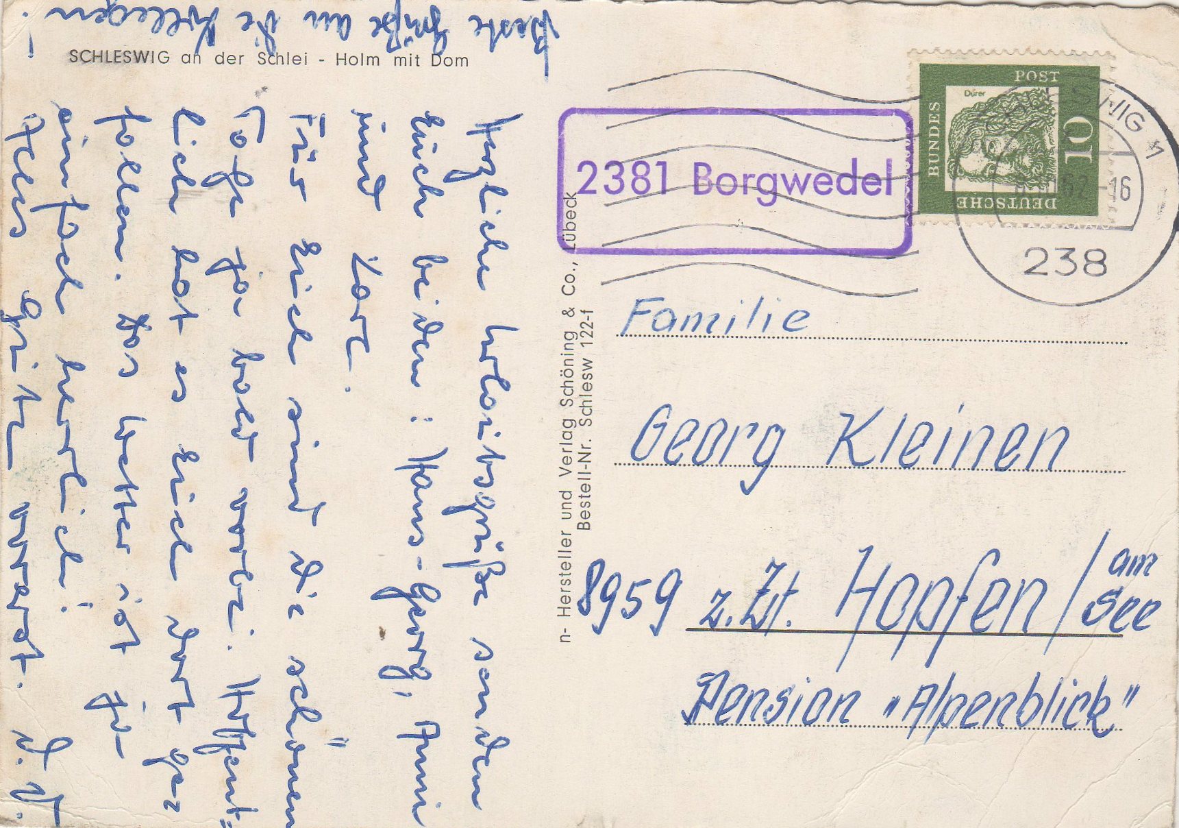 ich zeige heute eine Ansichtskarte aus Borgwedel nach Hannover-Kleefeld aus dem Jahr 1956. Borgwedel hatten wir schon mal im thread norddeutsche Ansichtskarten. Ich zeige die Vorderseite anschließend auch dort.
