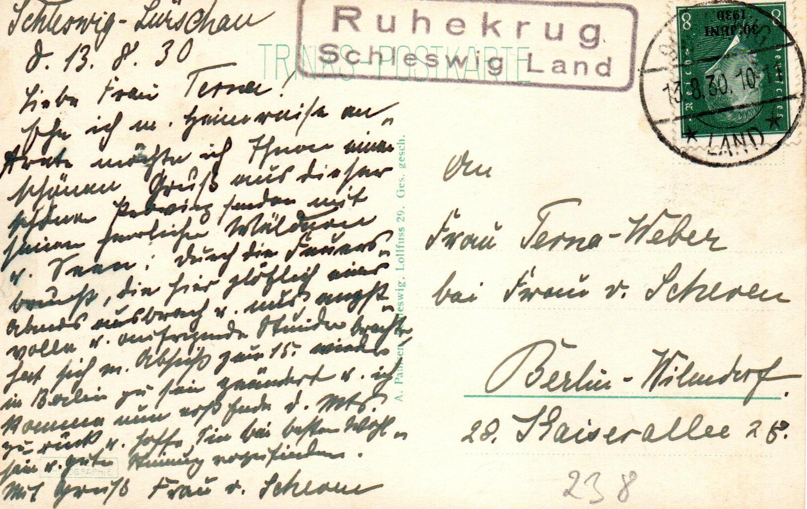 Ich zeige eine Postkarte die 1930 in Lürschau geschrieben und bei der Poststelle Ruhekrug nach Berlin-Wilmersdorf aufgegeben wurde.