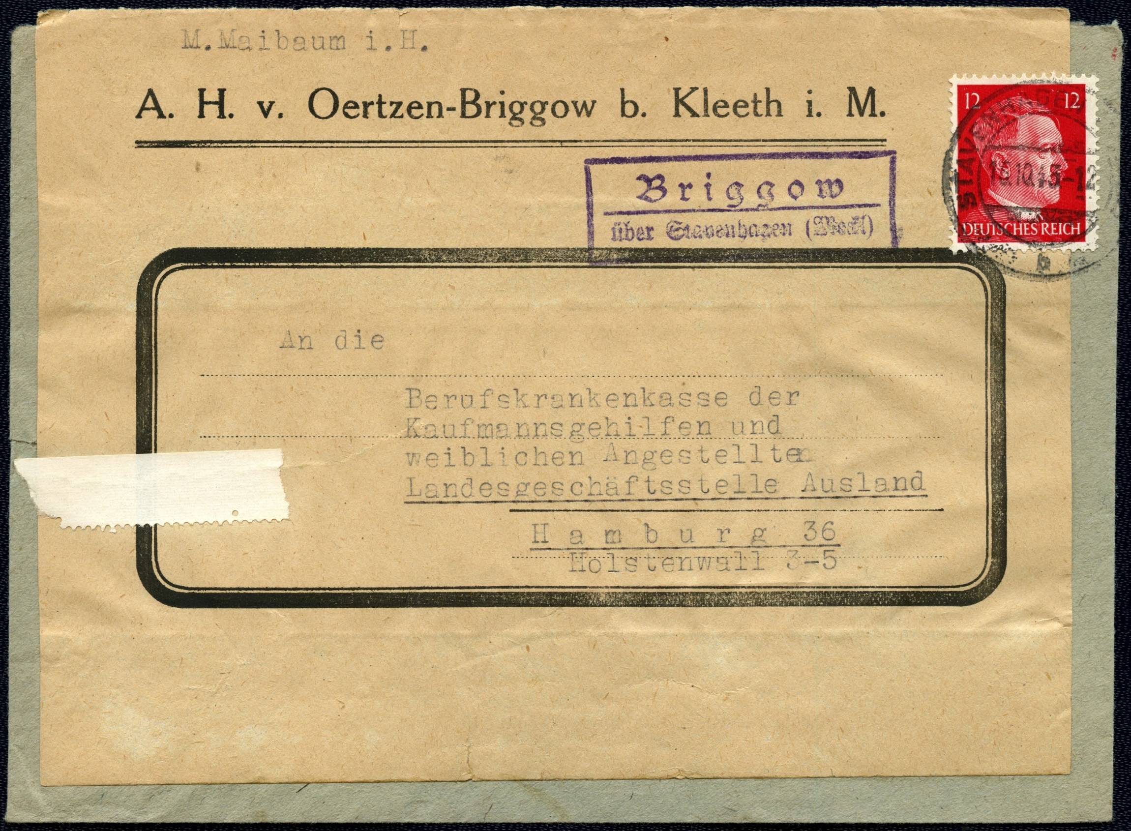 Stempelgerät zweizeiliger Rechteckstempel mit Strich Briggow / über Stavenhagen