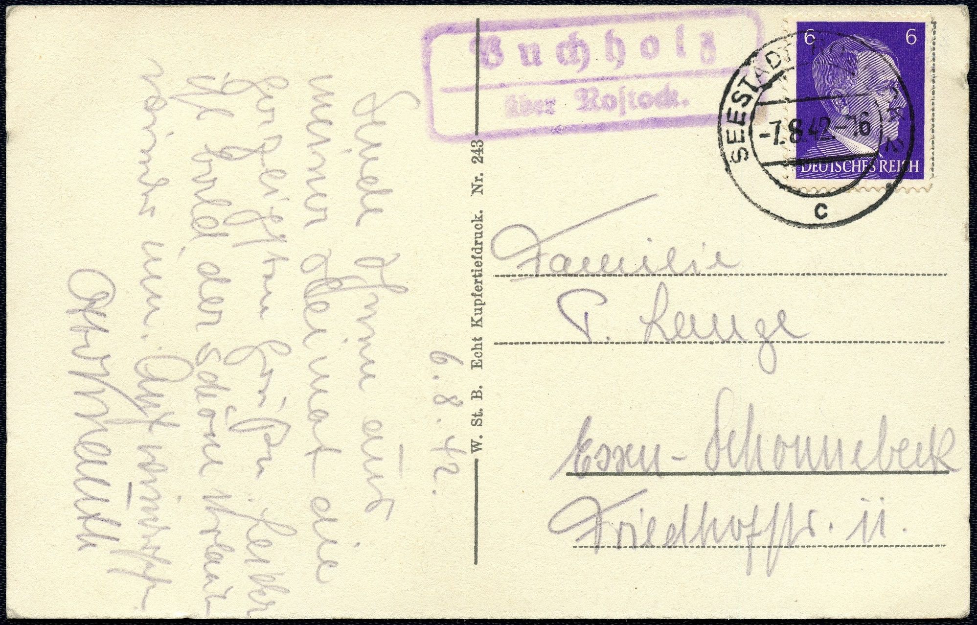 Hier eine (Kitsch-)Postkarte aus Grünholz nach Ludwigslust aus dem Jahr 1944. Der L2-Stempel "Grünholz / über Flensburg ist links neben der Frankatur abgeschlagen. Die 6 Pfg-Marke wurde mit dem Zweikresstegstempel "Flensburg g 27.11.44 16" entwertet (vermutlich Flensburg 1g, der Abschlag ist oben rechts sehr schwach)