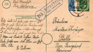 Bei Einrichtung der Landpostkurse war Klappholz der Endpunkt des Postkurses 4. Meine 10 Pfennig Posthorn-Ganzsachenpostkarte stammt aber aus der Nachkriegszeit. Sie wurde in Idstedtheide geschrieben , bei der Poststelle Klappholz aufgegeben und lief nach Stelle (Post Burgdorf). Der Halbspatelstempel "(24b) Klappholz / über Schleswig" wurde links neben der Frankatur abgeschlagen, der Wertstempel und die 2 Pfg. Notopfermarke wurde mit dem Zweikreisstegstempel "Schleswig a 14.8.52 - 13" entwertet. Ich vermute, dass es Schleswig 1a heißen muss, der Stempelabschlag ist aber rechts sehr schwach.