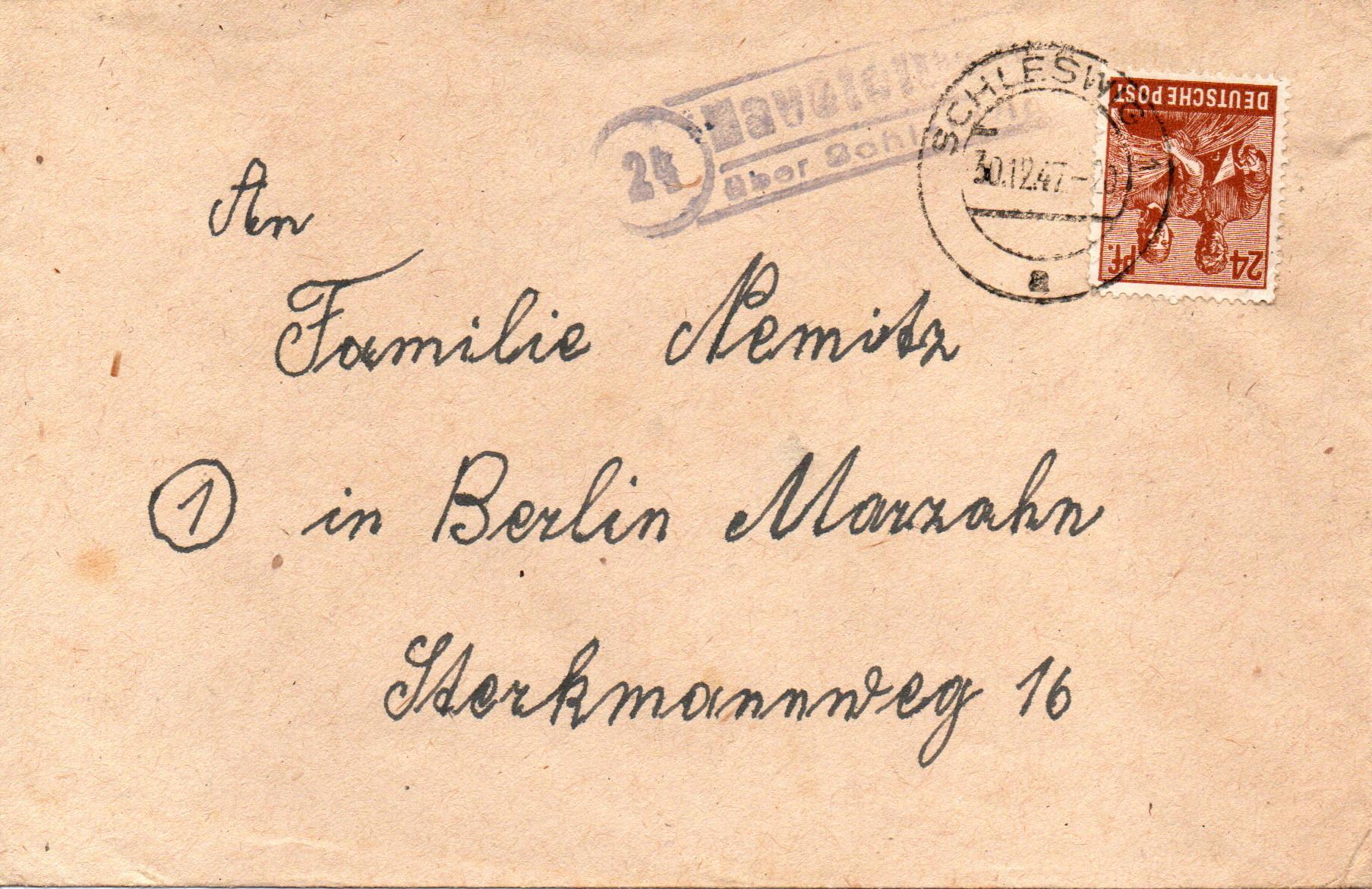 Hier nun ein nicht ganz so schöner Abschlag des Halbspatelstempels "(24) Havetoftloit / über Schleswig" auf einem Brief von Havetoftloit nach Berlin. Die 24 Pfg. Arbeitermarke wurde mit dem Zweikreisstegstempel "Schleswig 1a 30.12.47 -20" entwertet.