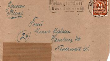 Hier nun ein (unten rechts angeschnittener) Brief aus Havetoftloit nach Hamburg aus dem Jahr 1946. Interessant hierbei auch dass es sich wohl um Kuvertrecycling handelt. Unter dem Papierstreifen unten links verbirgt sich der Absenderaufdruck der Fa. Walter Müller. Laut rückseitigem Firmenstempel war der Absender die Fa. Nicolaus Jensen.
