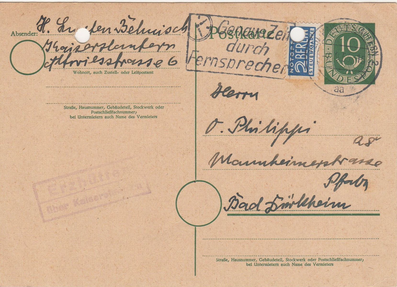Leitpostamt: (22b) Kaiserslautern 2 aa 7.9.1953