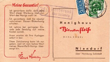 Heute zeige ich eine Bestellkarte an das Honighaus Bienenfleiss in Hamburg-Niendorf mit diesem Stempel aus dem Jahr 1954, also 20 Jahre später. Entsprechend "abgenutzt" sieht der Stempel auch aus.