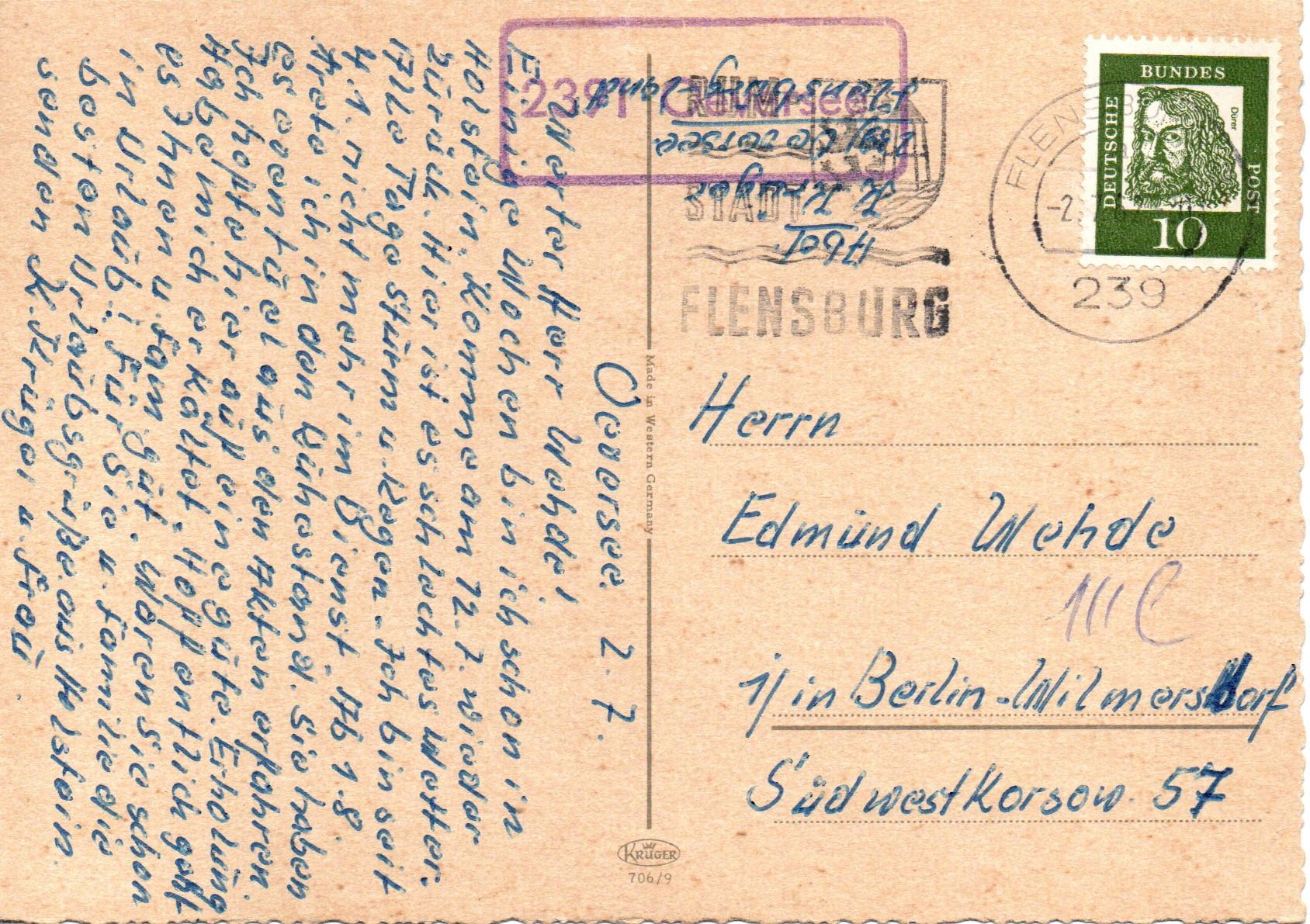 Die 10 Pfg. Dürer-Marke wurde mit einem Maschinenwerbestempel "239 Flensburg ? a 2.7.62 -20" entwertet, Werbefahne "RUM STADT FLENSBURG"