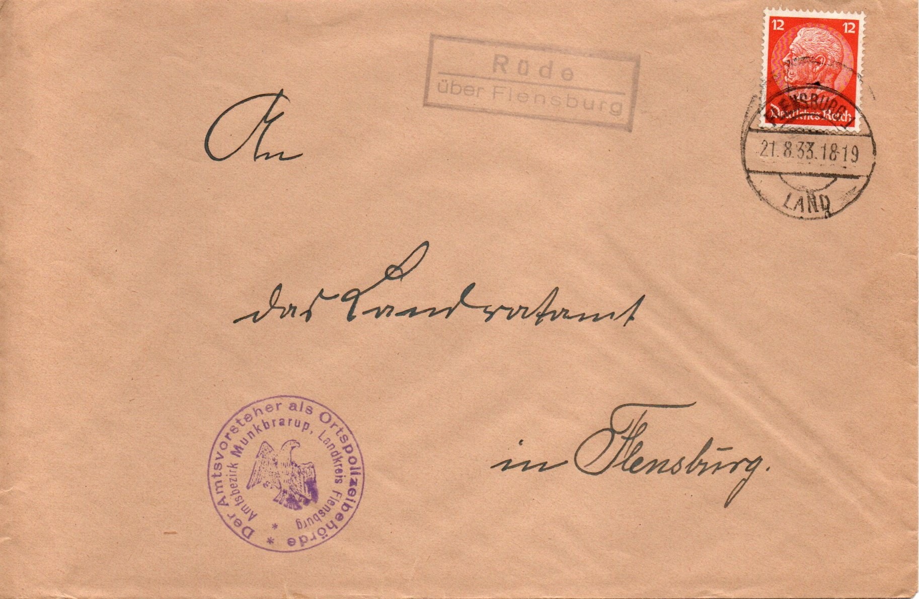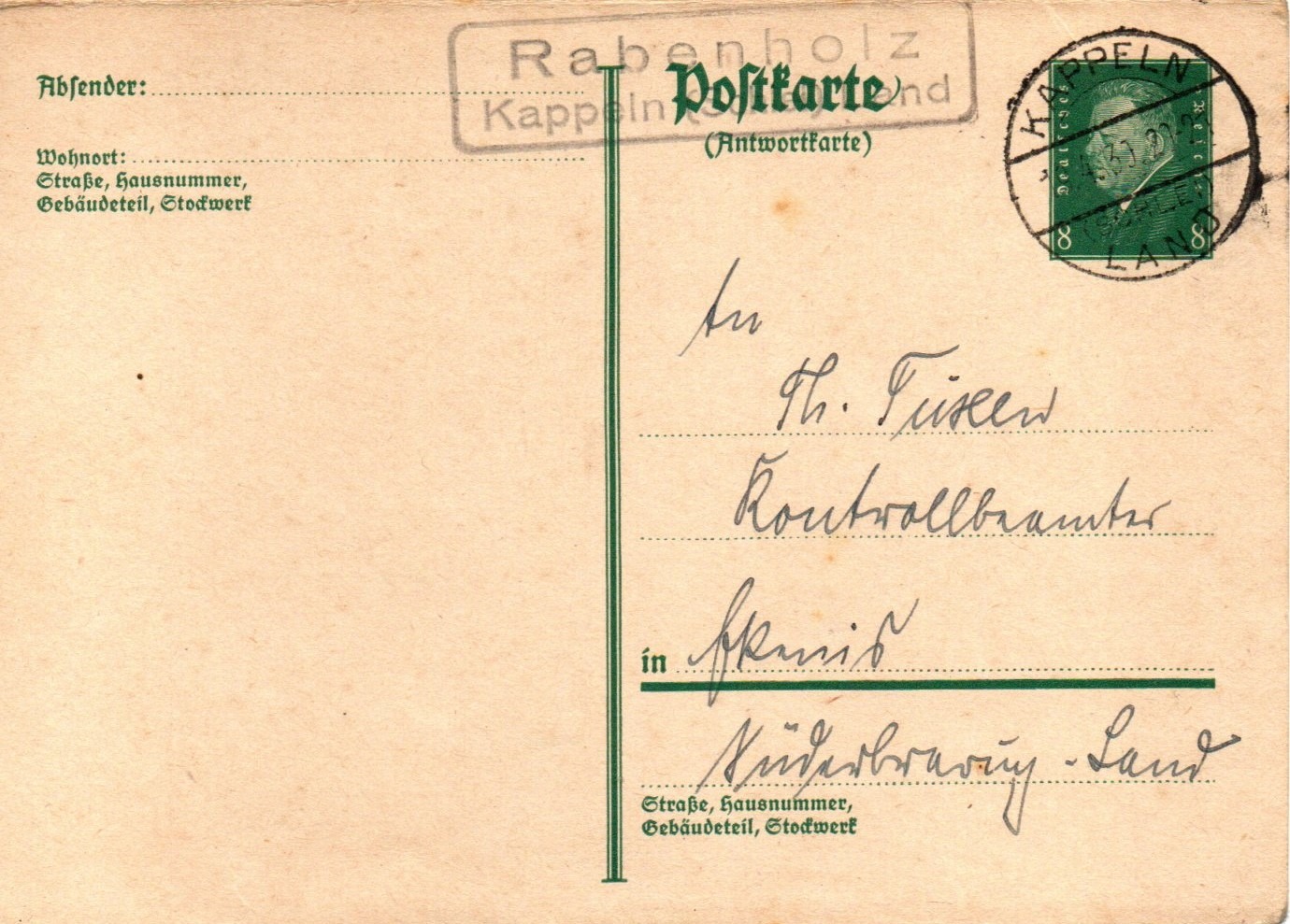 Heute nun ein Brief aus dem Jahr 1941 aus Hüllerup der bei der Poststelle in Neuholzkrug an das Arbeitsamt in Flensburg aufgegeben wurde. Ra2-Poststellenstempel (Frakturschrift) "Neuholzkrug / über Flensburg. Die 12 Pfg-Gröfaz Marke wurde im Leitpostamt mit dem Zweikreisstegstempel "Flensburg 1 f 21.9.41 -14" entwertet.