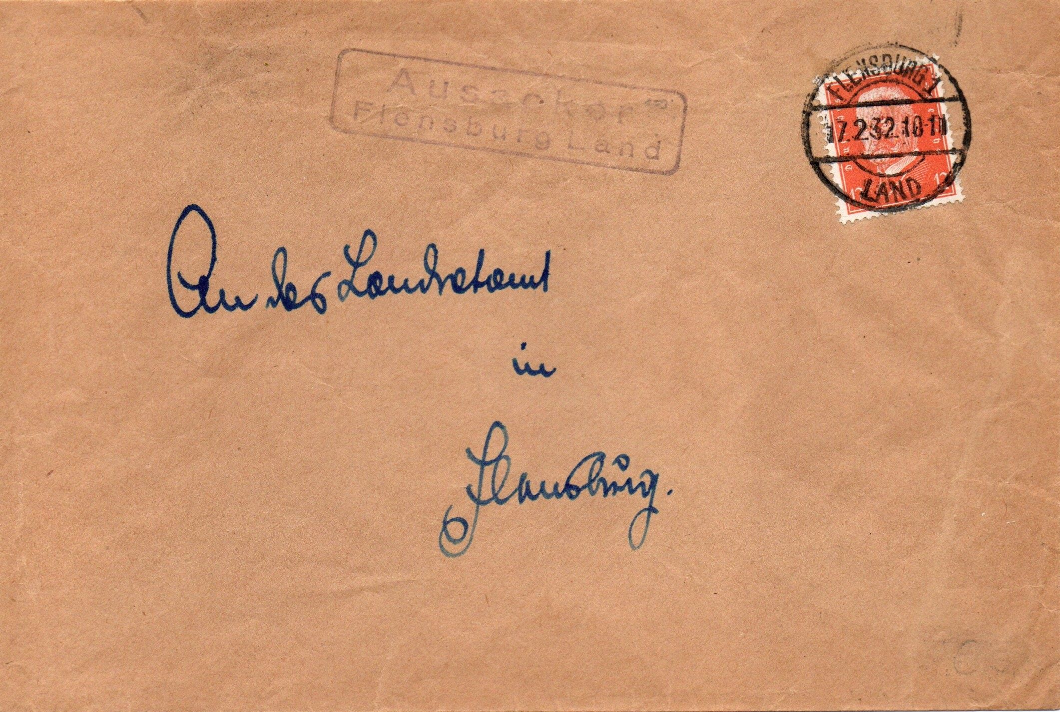 Hier ein Brief an das Landratamt(?) in Flensburg. Ra2-Stempel "Ausacker / Flensburg Land" Die 12 Pfg. Hindenburg-Marke wurde mit dem Stegstempel "Flensburg 1 Land 17.2.32 18-19" entwertet.