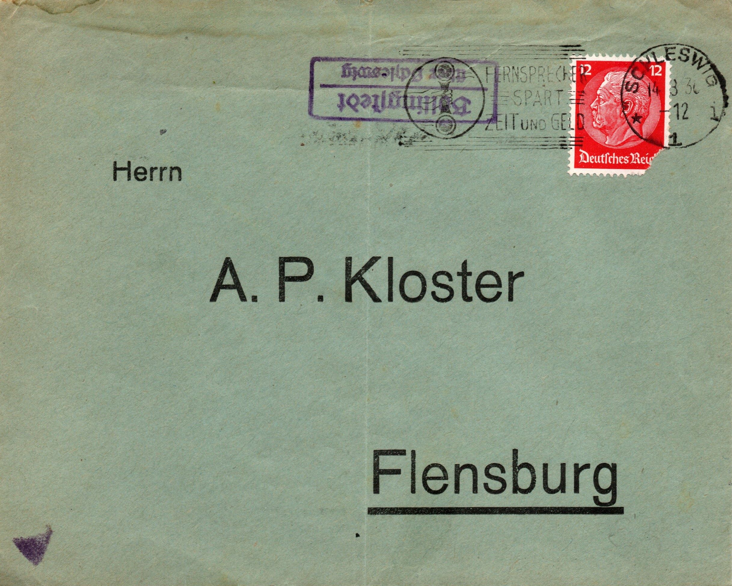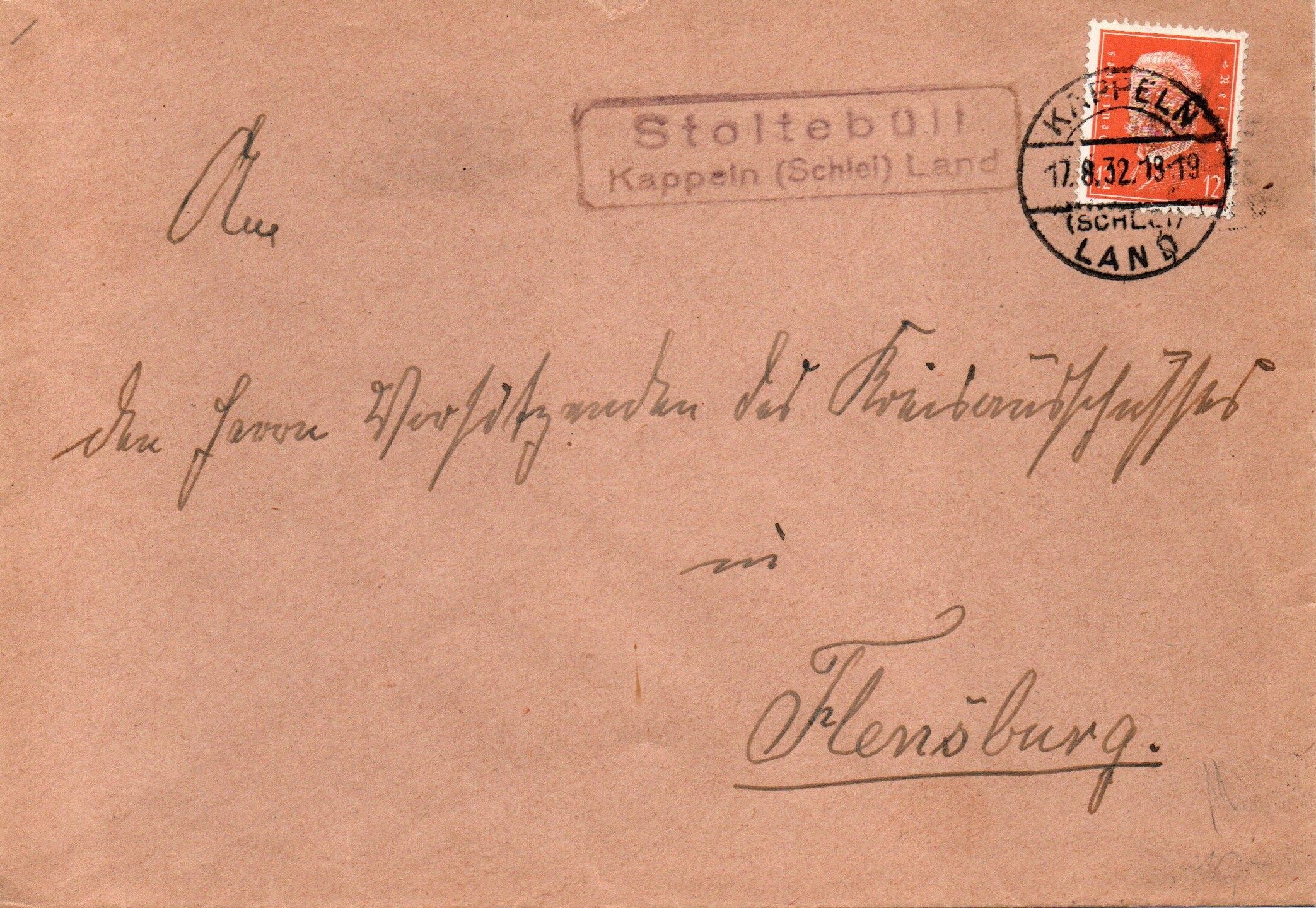 Belege der Poststelle II in Stoltebüll habe ich auch schon in der Vergangenheit zeigen können. Auch hier nun die Urform der Poststellenstempel auf einem Brief an den Vorsitzenden des Kreisausschusses in Flensburg aus dem Jahr 1932