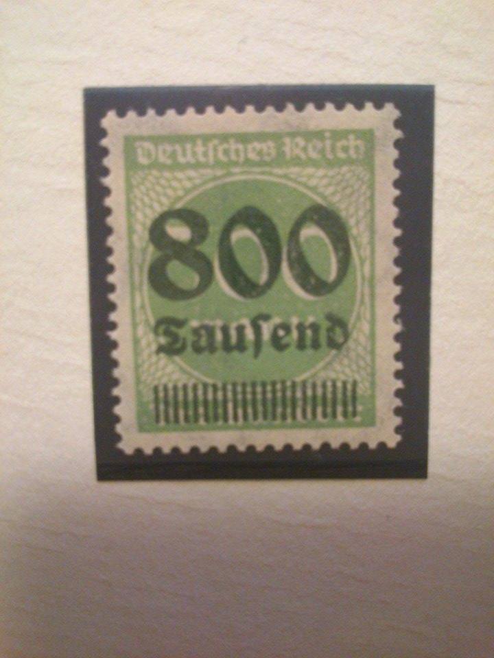 Auf einer Internetseite habe ich gesehen, dass die grüne Briefmarke des Deutschen Reiches mit der 500 Mark von der 800 Tausend überdruckt viel Wert ist.