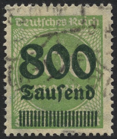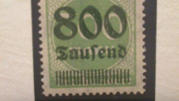 Auf einer Internetseite habe ich gesehen, dass die grüne Briefmarke des Deutschen Reiches mit der 500 Mark von der 800 Tausend überdruckt viel Wert ist.