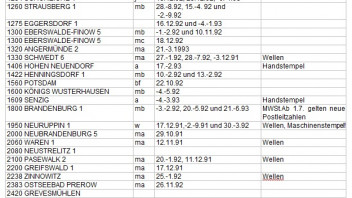 wie ich der Tabelle entnehme, fehlt euch der ganze Osten, also Seelow, Letschin, Wriezen, Bad Freienwalde, Angermünde und kleinere Orte mit Postamt. Mal sehen, was ich habe.