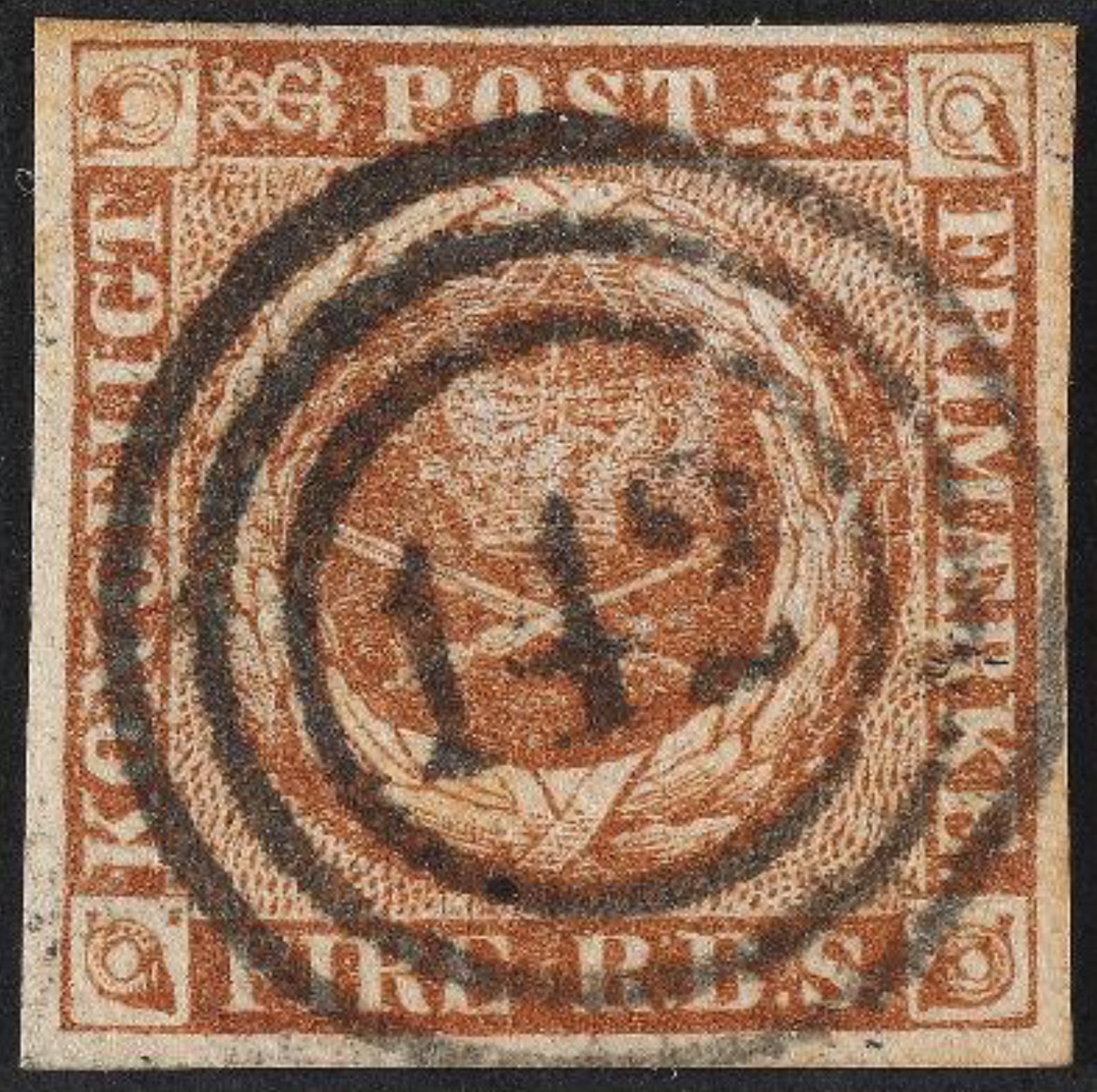 1854 - 4 RBS - Thiele III - Platte IV - Feld 63 - graubraun mit einem (ziemlich) perfekten Nummernstempel 142 (Horst). Ein ungewöhnlich schönes Stück mit einem der seltensten Nummernstempeln auf der 4 RBS. Sicher nicht mit der Seltenheit von Nordstrand, Pellworm oder gar Høruphav vergleichbar, aber man muss gefordert bleiben. Ex. Borch Jensen.