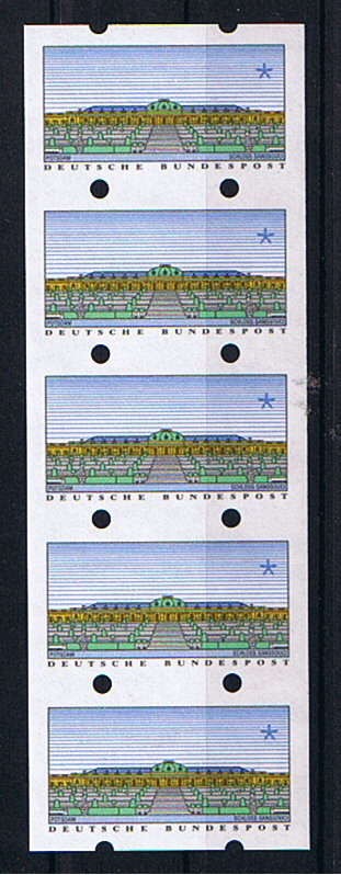 Es handelt sich um einen 5er Streifen ATM 2 "Sanssouci", im Prinzip wertlos. Da erst durch den Aufdruck es zu einer Marke wurde, wenn man einen Automatenbestücker kannte, gibt einem der schon gerne welche ab, bzw. beim Fixieren im Automaten fallen immer Leerstücke an.