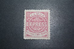 Samoa Express - AGAR Privatpost von 1877: 1 Penny blau, 2 Pence rosa, 5 Shilling grün.