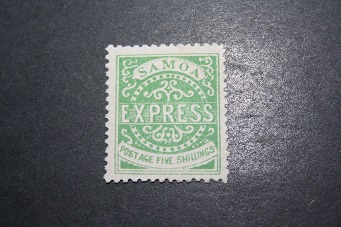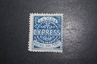 Samoa Express - AGAR Privatpost von 1877: 1 Penny blau, 2 Pence rosa, 5 Shilling grün.