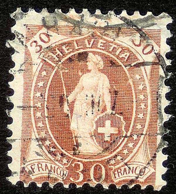 Eine "Stehende Helvetia", SBK-Nr. 68E. Im "Schweiz Spezial" wird dieser Plattenfehler unter folgender Nummer gelistet:
