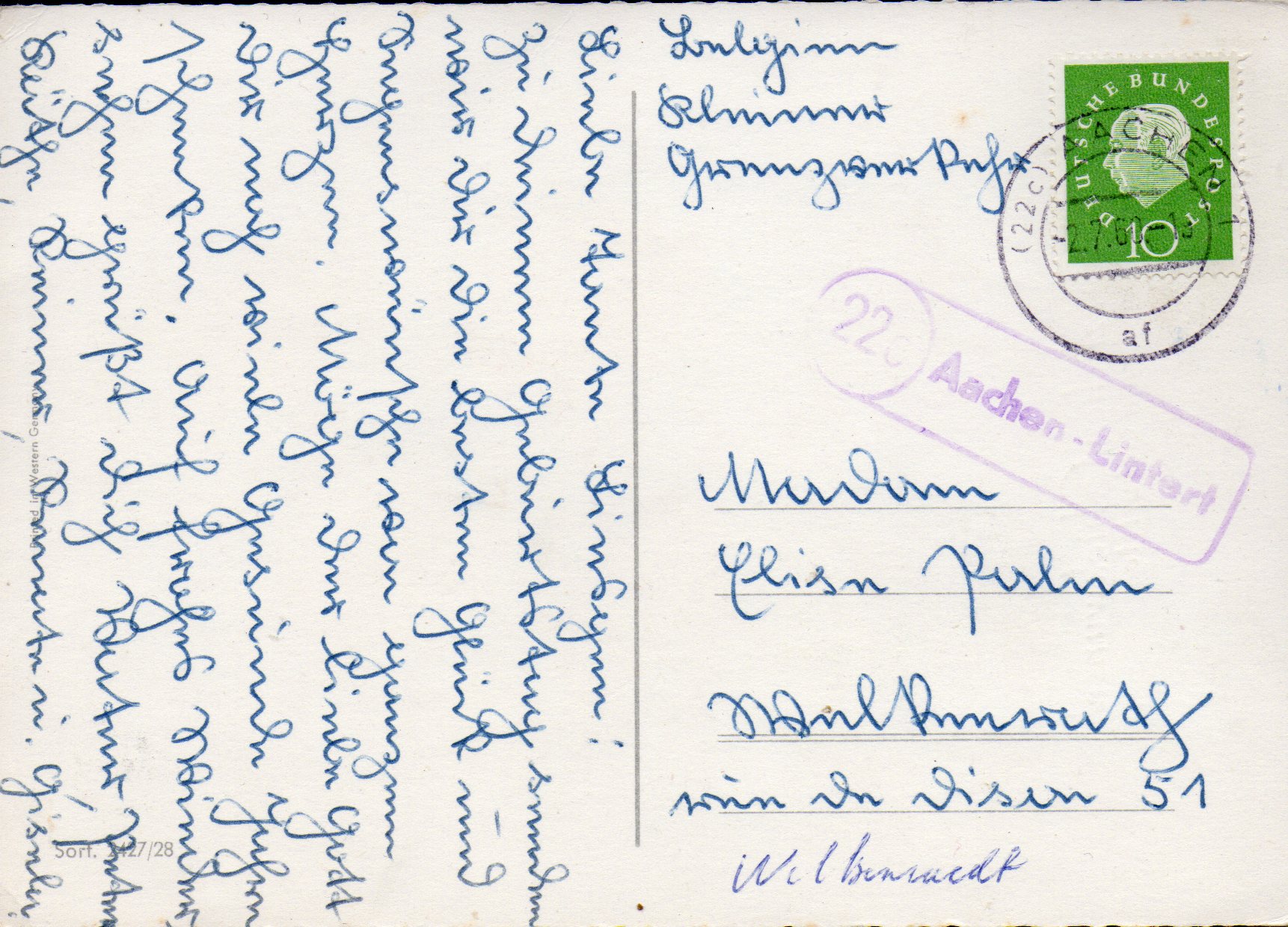 evtl. Madame Elise Palm, Welkenraedt, Rue de Dison 51. Welkenraedt liegt in Belgien, wenige Kilometer von Aachen entfernt, könnte ein Grenzportotarif sein. Interessante Karte!