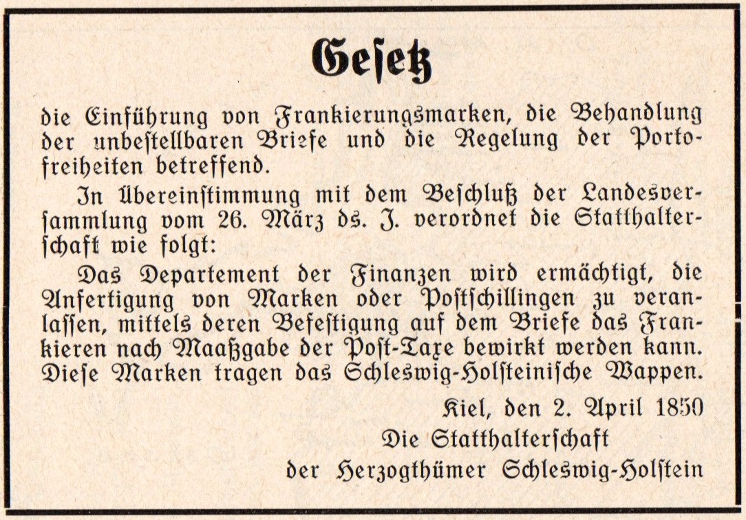 Die Provinzversammlung vom 26. März 1850 bevollmächtigte das Finanzministerium zur Herstellung von Briefmarken, welche das Wappen von Schleswig-Holstein tragen sollten. Aus etwa 100 Entwürfen wurde jener von Dietrich C. Claudius angenommen, und nachdem man sich über die Wertstufen (zu 1 und 2 Schilling) geeinigt hatte, wurde der Firma H. W. Köbner & Lehmkuhl in Altona der Druck der Marken übertragen.