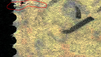 So wie in den Abb. sehen Marken aus, bei denen ein solcher Riss geschlossen wird. Das wird in der Regel mit Gummi arabicum gemacht und ist auch in Ordnung, um einen fortschreitenden Einriss zu verhindern. Allerdings sollte man dann auch das Kind beim Namen nennen. Wenn das Markenbild berüht ist, handelt es sich in jedem Fall um einen Mangel. Was hier zu sehen ist, ist ein fetter Einriss.