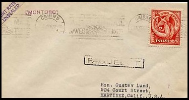 Im Stempelkopf steht oben der Ort CAIRNS, unten müsste QUEENSLAND stehen.Der Brief wurde auf einem Schiff, wohl von Papua aus aufgegeben (PAQUEBOAT) und dann im nächsten Hafen mit Postabfertigung, Cairns, zur Post gebracht und dort richtig entwertet.