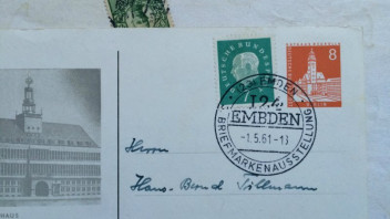 per Zufall habe ich heute eines der beiden Bilder mit dem Stempel "EMBDEN" zur 3. Briefmarkenausstellung am 1. Mai 1961 in Emden entdeckt und, weil mir der für meine Begriffe Setzfehler (?) ins Auge stach, nach vergleichbarem Material gegoogelt und habe auch einen zweiten Abschlag entdeckt.