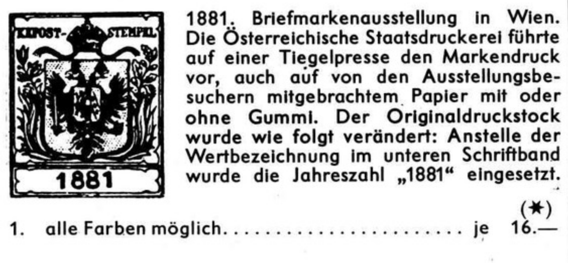 Unter der Bezeichnung "Erzeugung von Briefmarken" wurden von der k.k. Staatsdruckerei mit eigens zu diesem Zweck hergestellten Druckplatten Marken in der Zeichnung der Ausgabe 1850 vor den Augen des Publikums auf einer großen Fußpresse in blauer Farbe gedruckt. Die Wertangabe wurde durch die Jahreszahl "1881" ersetzt.