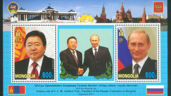 Der umstrittene russische Präsident Putin hat es auch auf Briefmarken geschafft, zwar nicht auf Marken seines Heimatlandes, sondern mehr auf exotische Briefmarken von Ländern, denen er schon einen Staatsbesuch abgestattet hat. Das muß natürlich gleich auf Briefmarken oder besser auf teureren Blöcken dokumentiert werden, möglichst zusammen mit den heimischen Staatsoberhäuptern.