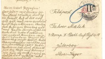 Beim Stöbern durch einen Feldpostbestand aus dem I. Weltkrieg bin ich auf diese Ansichtskarte gestoßen, die nicht nur mit einem Nachporto belegt worden ist, sondern im Bereich des Markenfeldes auch noch einen mir unbekannten schwarzen Aufdruck enthält. Die karte wurde am 1. März 1917 in Berlin Schöneberg 1 abgestempelt.