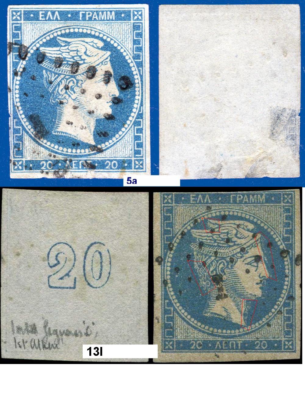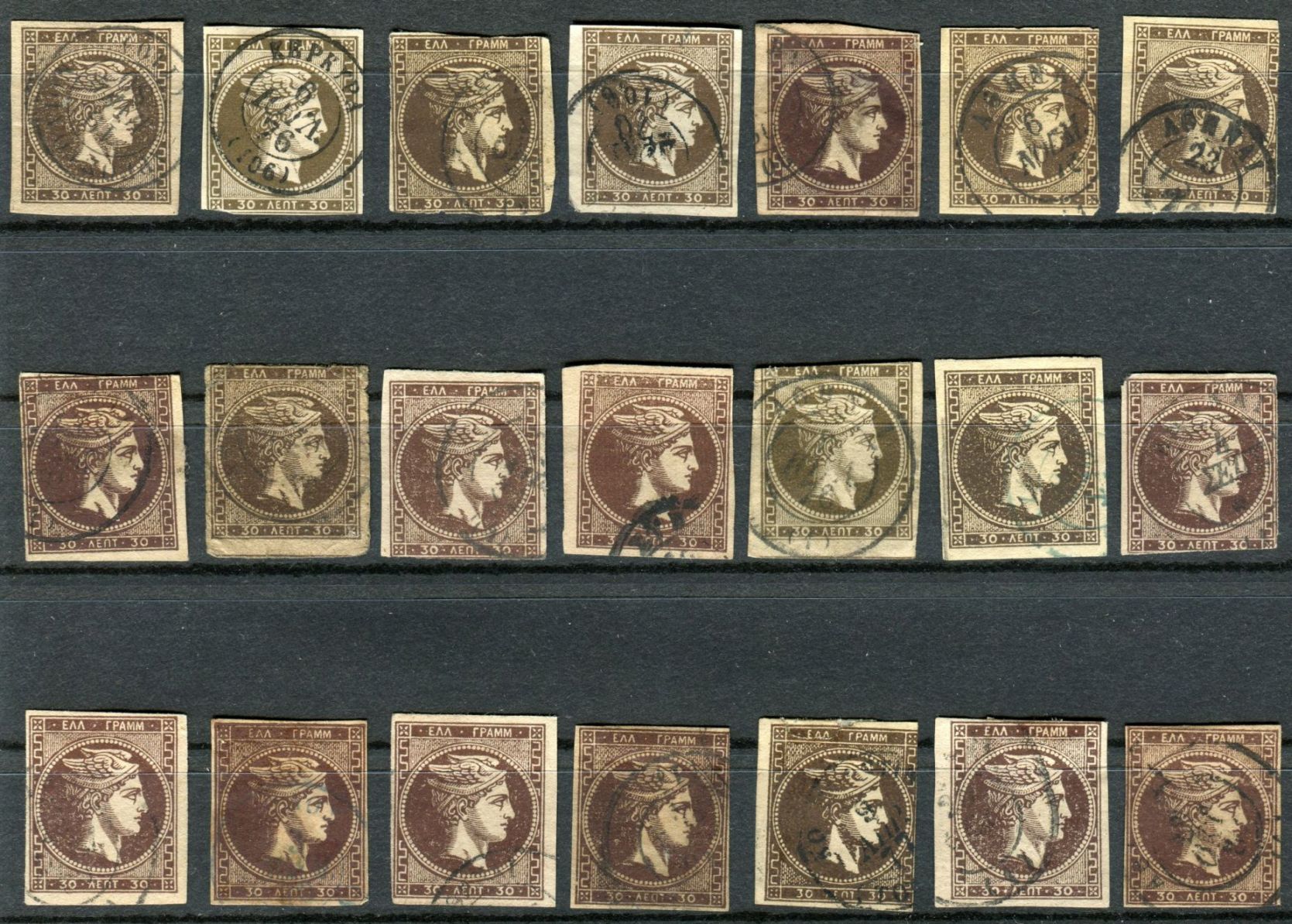 Zum "Einstieg" habe ich gedacht, sollte man evtl. mit den am einfachsten zu bestimmenden Marken beginnen. Mangels eines aktuell vorliegenden 60 Lepta-Wertes rot werden schlage ich dann vor, mit den 30 Lepta-Werten zu beginnen.