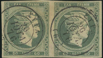 soeben ist mir beim zweiten Ansehen aufgefallen, dass die rechte Marke Deines grünen 60 Lepta-Paares das eine Echtheitsmerkmal (Unterbrechung im linken oberen Maschenmuster (2. senkrechte Linie von links)), anders als die linke Marke, nicht zeigt. Demnach könnte es sich auch u.U. um eine Fälschung handeln, was evtl. auch zu dem unklaren Druck (besonders bei dieser rechten Marke) geführt haben könnte.