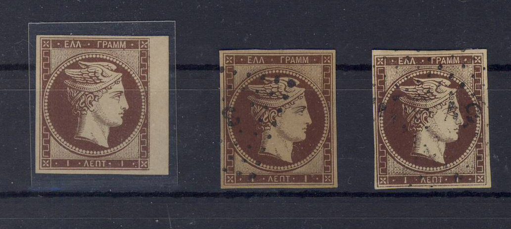 Vor der Paris-Ausgabe wurden Probedrucke (ohne Gummi) vorgenommen. Die letzten Probedrucke, bei denen die erwünschte Farbe und Druck erreicht worden waren, lassen sich von den ungestempelten Pariser Marken ohne Gummi praktisch nicht unterscheiden. Deshalb vielleicht "1A". Alle 3 müssten aus Paris kommen, die unterbrochenen Wangenlinien sprechen stark dafür. Die Griechen alleine konnten nie wieder unterbrochene Linien am Gesicht drucken.