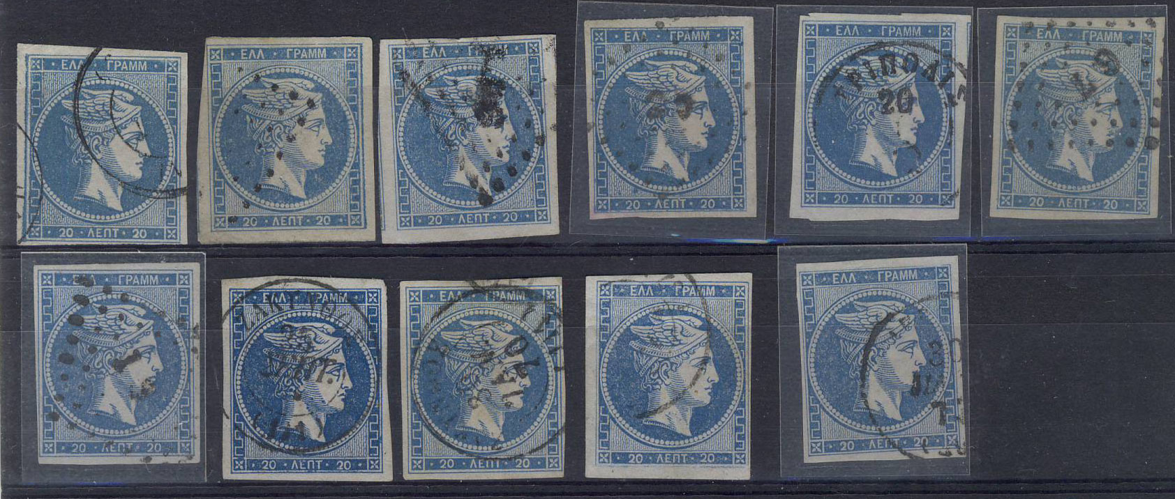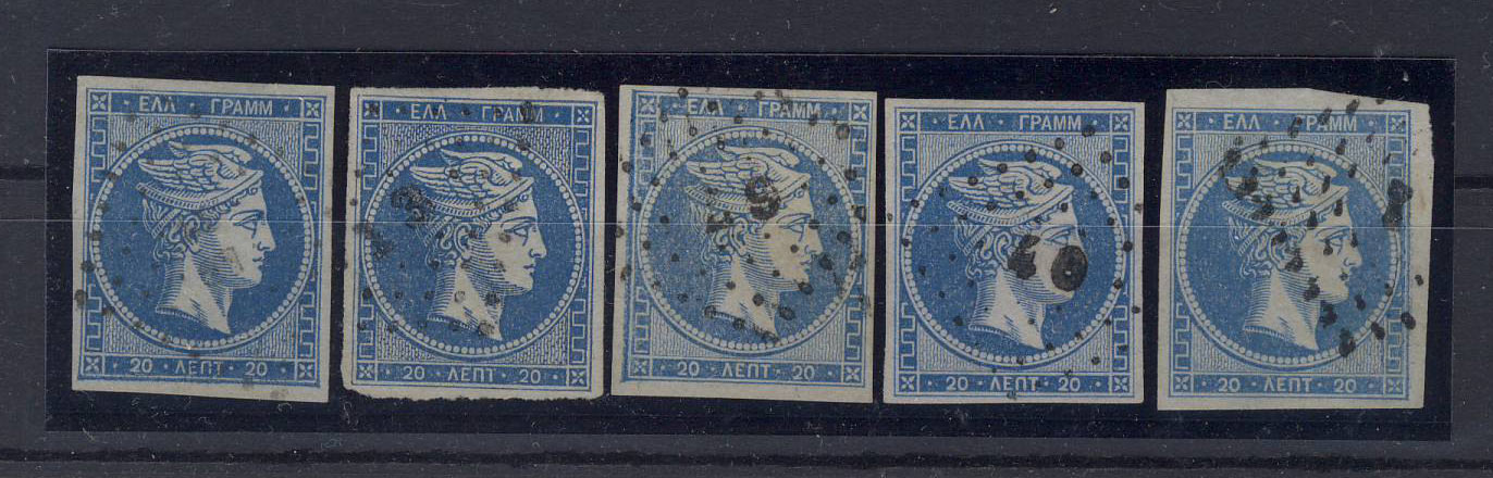 Bei der ersten tippe ich auf die Karamitsos-Nummern 15, 13I (?) und 19, bin mir aber nicht sicher, da der 20-Lepta-Wert evtl. noch zu grob (Punkte zwischen Wellenlinien zwar sauber getrennt/freistehend, aber z.B. Augenpartie sehr grob gedruckt) für die "coarse impressions" ist. Der Punkt-Rautenstempel "110" stammt von den Ionischen Inseln (Argostolion bzw. Kefallinia).