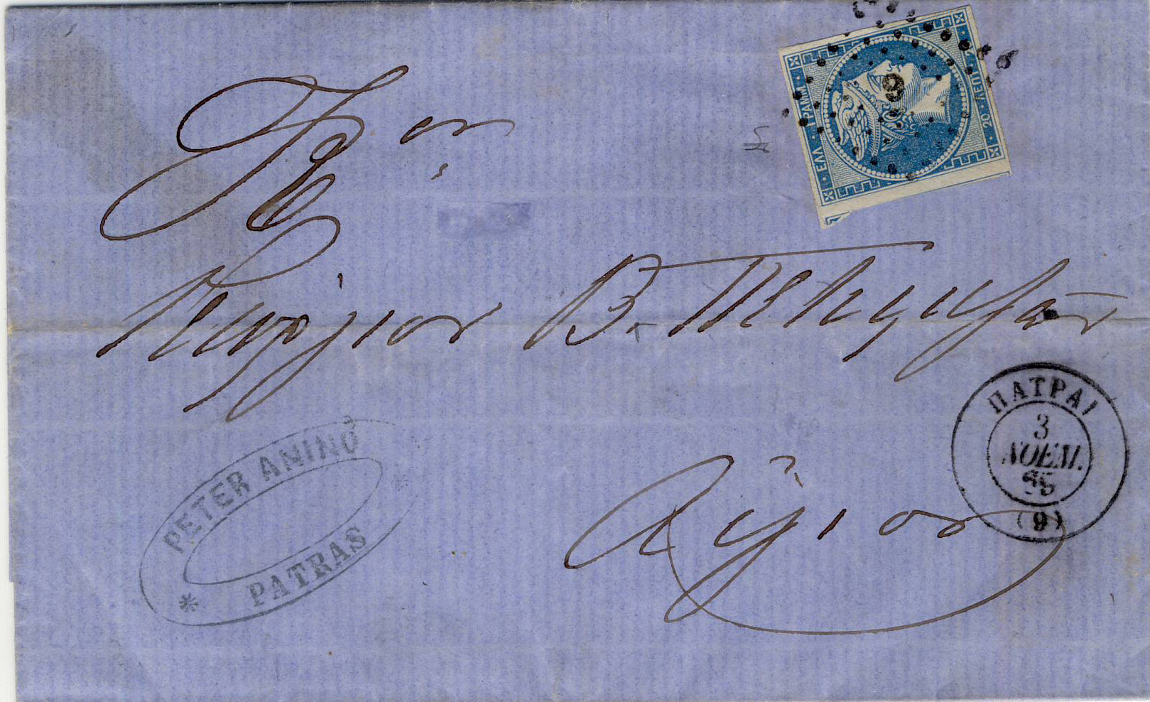 Da der Poststempel auf den 17. August 1864 (?, Kyrillische Schriftzeichen sind für mich ein Buch mit sieben Siegeln) hindeutet und es sich nicht um einen Pariser Druck handelt und weder die Nr. 8 noch die Nr. 13 infrage kommt, da der Druck m.M.n. auch für die "Coarse impressions" zu grob ist, müßte es sich um die Nr. 19 ("Consecutive Athens printings") handeln. Teilt Ihr diese Einschätzung und könnt Ihr evtl. etwas über den Adressaten des Belegs (Zieladresse, aufgegeben wurde er anhand des Punkt-Rautenstempels wohl in Nauplion/Nafplio) herausfinden?