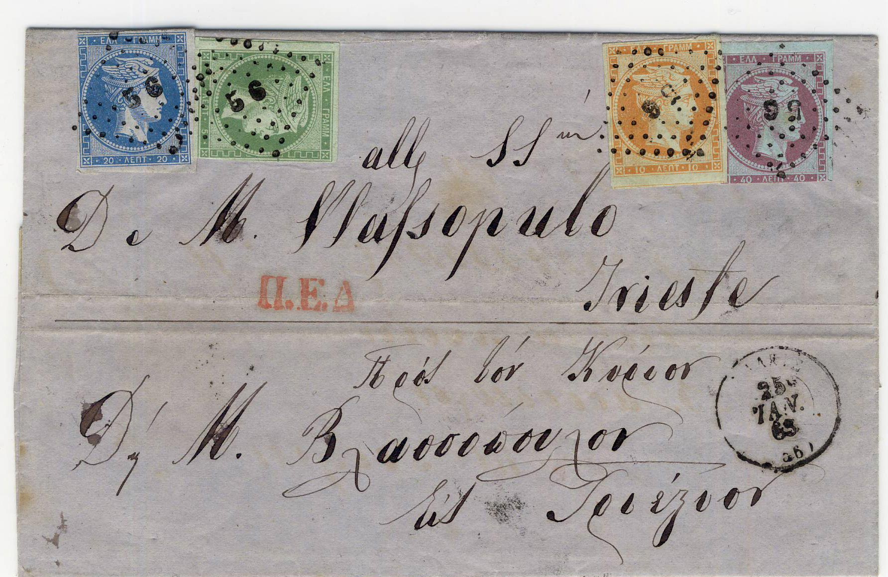 Und zu guter letzt einen meiner schönsten Hermeskopfbriefe. Gesendet wurde der Brief von Athen nach Triest 1863. Dabei ist u.a. eine 19a. Vielleicht kann jemand bestimmen, welche die anderen drei sind. Leider habe ich fast kaum solch schöne Hermes-Briefe.